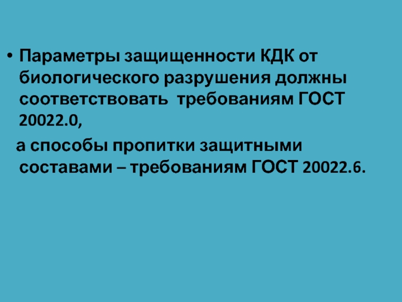 Параметры защищенности КДК от биологического разрушения должны соответствовать требованиям ГОСТ