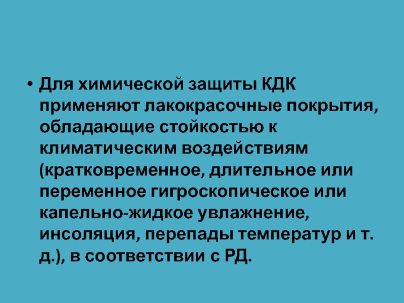 Слайд 37Для химической защиты КДК применяют лакокрасочные покрытия, обладающие стойкостью к