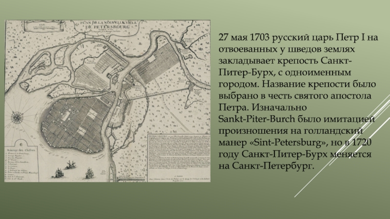 27 мая 1703 русский царь Петр I на отвоеванных у шведов землях закладывает крепость Санкт-Питер-Бурх, с одноименным городом. Название крепости было выбрано в честь святого апостола Петра. Изначально Sankt-Piter-Burch было имитацией