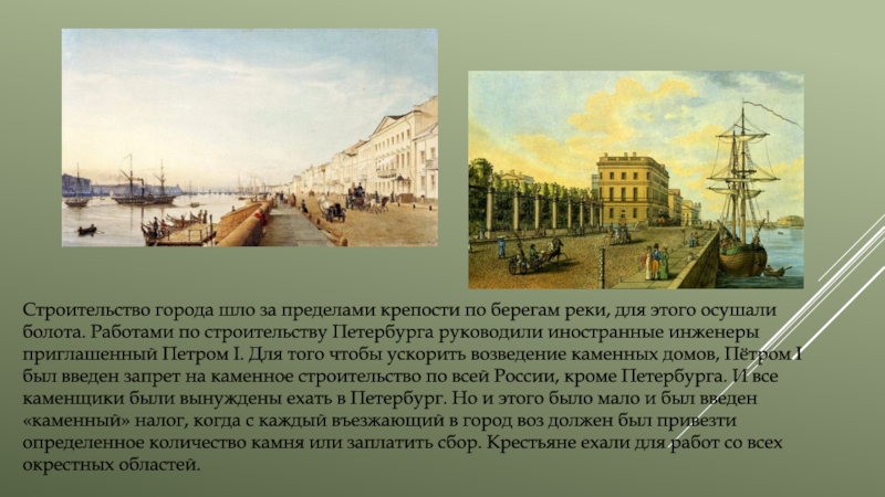 приглашенный Петром I. Для того чтобы ускорить возведение каменных домов, Пётром I был введен запрет на каменное строительство по всей России, кроме Петербурга. И все каменщики были вынуждены ехать в Петербург. Но и этого было мало и был введен «каменный» налог, когда с каждый въезжающий в город воз должен был привезти определенное количество камня или заплатить сбор. Крестьяне ехали для работ со всех окрестных областей.