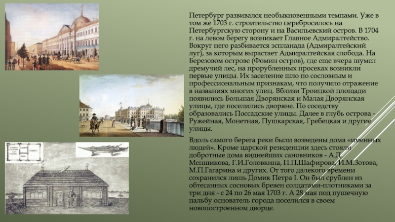 Петербург развивался необыкновенными темпами. Уже в том же 1703 г. строительство перебросилось на Петербургскую сторону и на