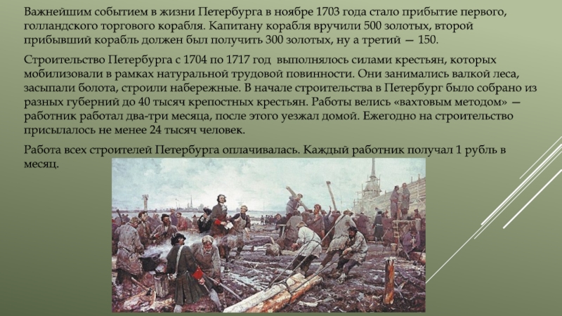Строительство Петербурга с 1704 по 1717 год выполнялось силами крестьян, которых мобилизовали в рамках натуральной трудовой повинности. Они занимались валкой леса, засыпали болота, строили набережные. В начале строительства в Петербург было собрано из разных губерний до 40 тысяч крепостных крестьян. Работы велись «вахтовым методом» — работник работал два-три месяца, после этого уезжал домой. Ежегодно на строительство присылалось не менее 24 тысяч человек.