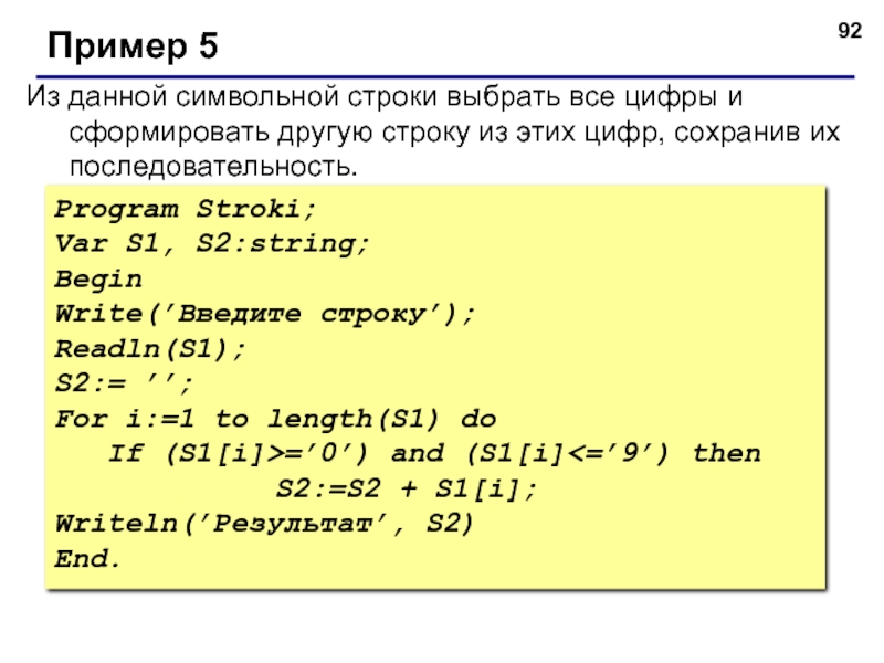 Слайд 92Из данной символьной строки выбрать все цифры и сформировать другую