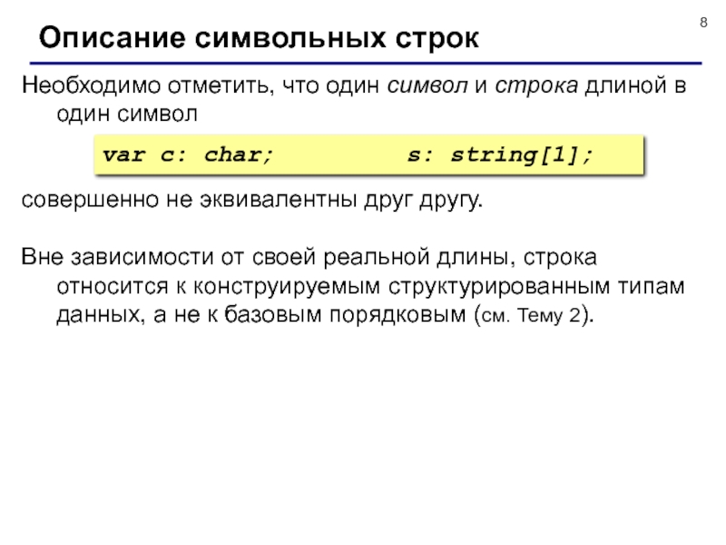 Слайд 8Необходимо отметить, что один символ и строка длиной в один