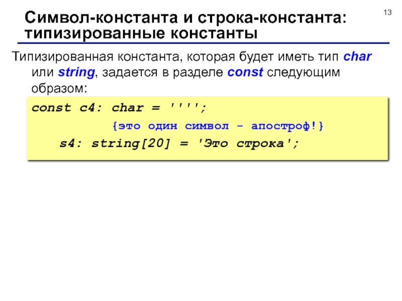 Слайд 13Типизированная константа, которая будет иметь тип char или string, задается