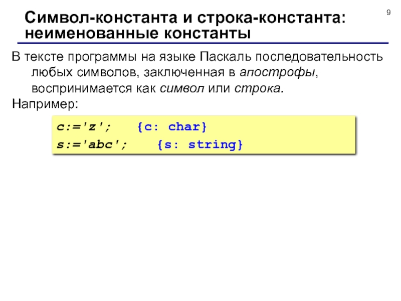 Слайд 9В тексте программы на языке Паскаль последовательность любых символов, заключенная