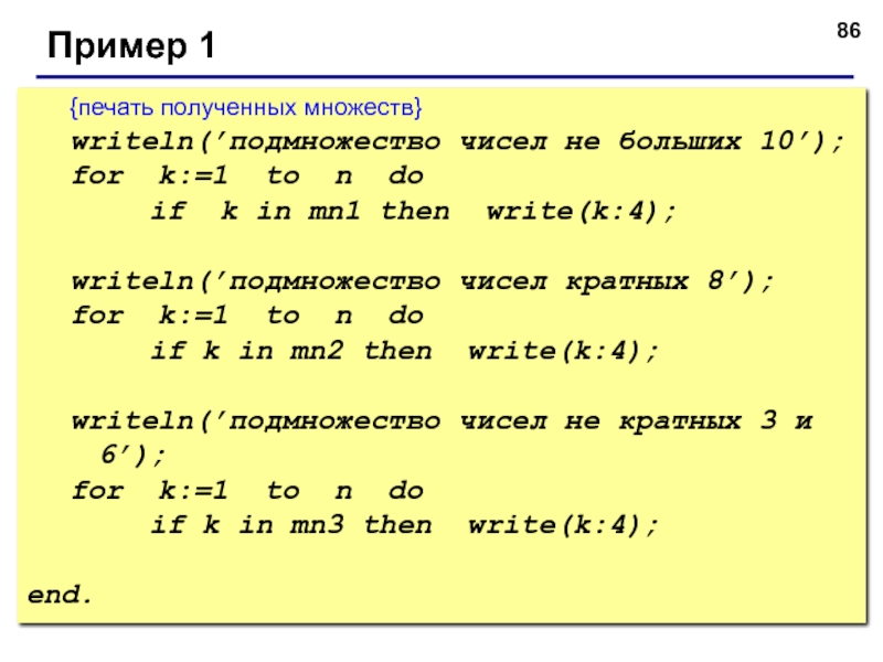 writeln(’подмножество чисел не кратных 3 и 6’);