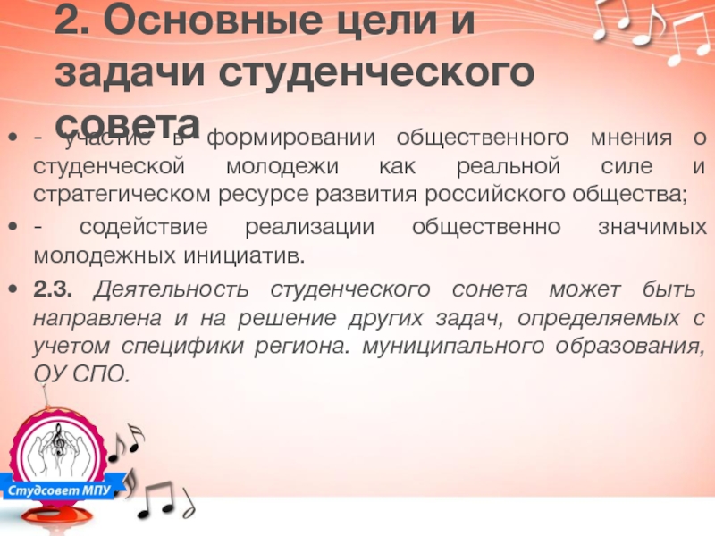 Слайд 112. Основные цели и задачи студенческого совета