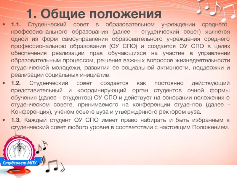 1.3. Каждый студент ОУ СПО имеет право набирать и быть избранным в студенческий совет любого уровня в соответствии с настоящим Положением.