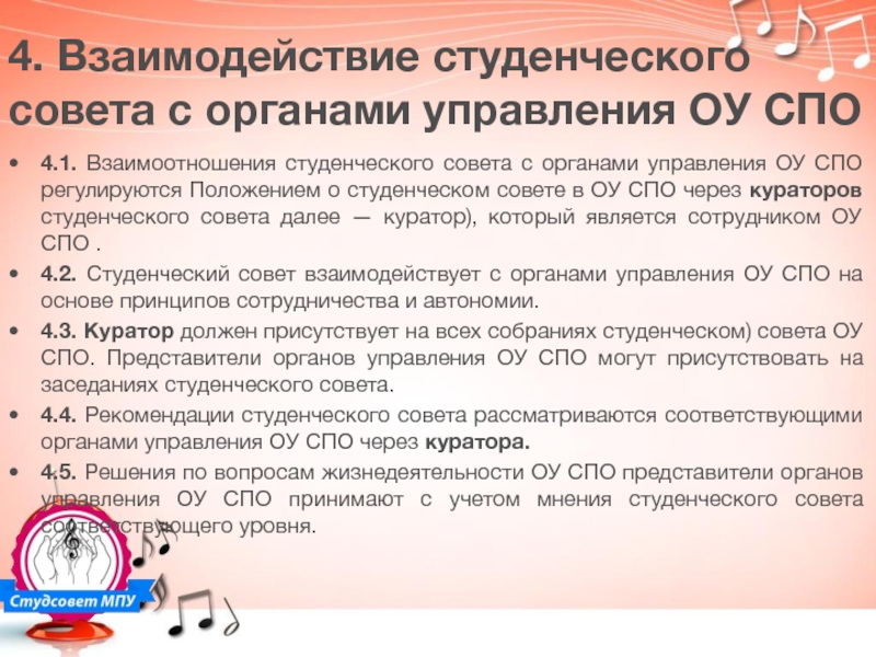 4.2. Студенческий совет взаимодействует с органами управления ОУ СПО на основе принципов сотрудничества и автономии.