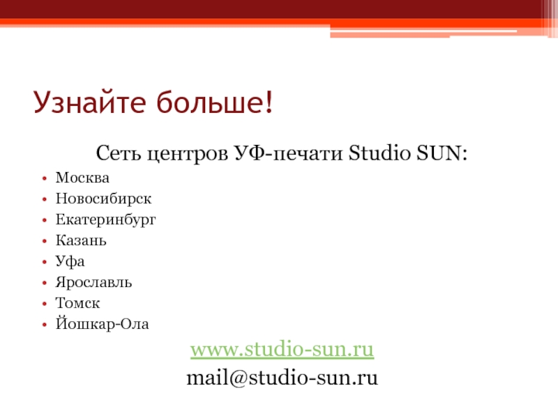 Узнайте больше!Сеть центров УФ-печати Studio SUN:Москва Новосибирск Екатеринбург Казань Уфа Ярославль Томск Йошкар-Ола www.studio-sun.rumail@studio-sun.ru