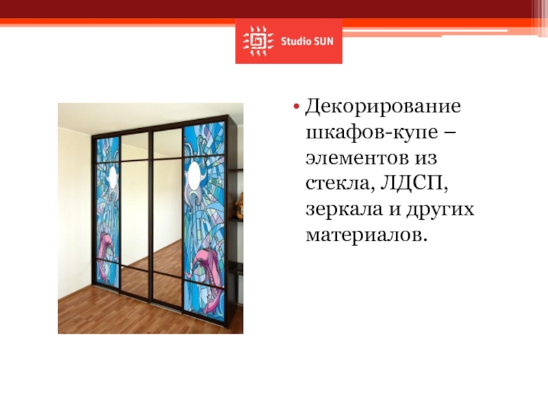 Слайд 7Декорирование шкафов-купе – элементов из стекла, ЛДСП, зеркала и других