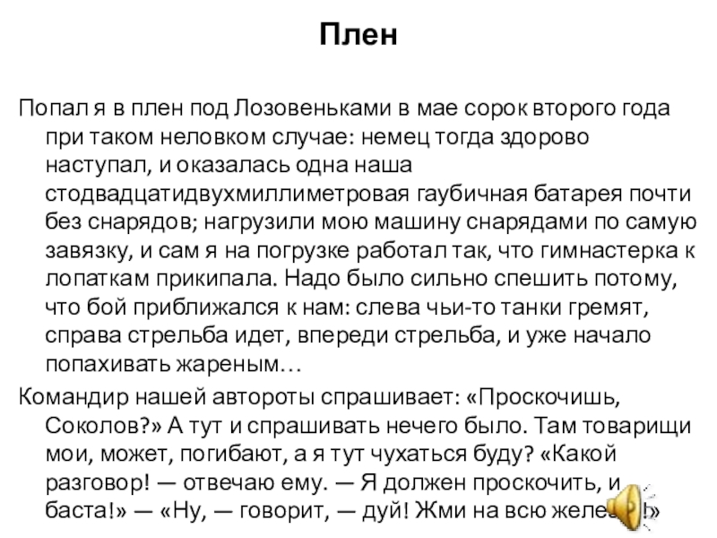 Командир нашей автороты спрашивает: «Проскочишь, Соколов?» А тут и спрашивать нечего было. Там товарищи мои, может, погибают, а я тут чухаться буду? «Какой разговор! — отвечаю ему. — Я должен проскочить, и баста!» — «Ну, — говорит, — дуй! Жми на всю железку!»
