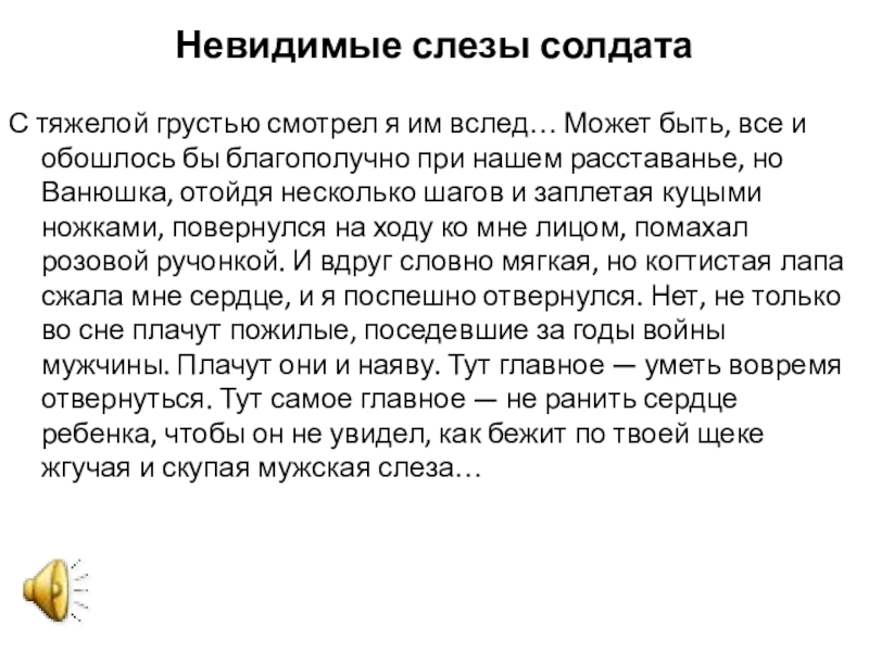 Ванюшка, отойдя несколько шагов и заплетая куцыми ножками, повернулся на ходу ко мне лицом, помахал розовой ручонкой. И вдруг словно мягкая, но когтистая лапа сжала мне сердце, и я поспешно отвернулся. Нет, не только во сне плачут пожилые, поседевшие за годы войны мужчины. Плачут они и наяву. Тут главное — уметь вовремя отвернуться. Тут самое главное — не ранить сердце ребенка, чтобы он не увидел, как бежит по твоей щеке жгучая и скупая мужская слеза…