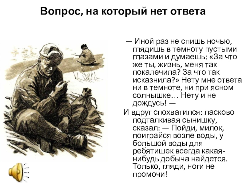 И вдруг спохватился: ласково подталкивая сынишку, сказал: — Пойди, милок, поиграйся возле воды, у большой воды для ребятишек всегда какая-нибудь добыча найдется. Только, гляди, ноги не промочи!