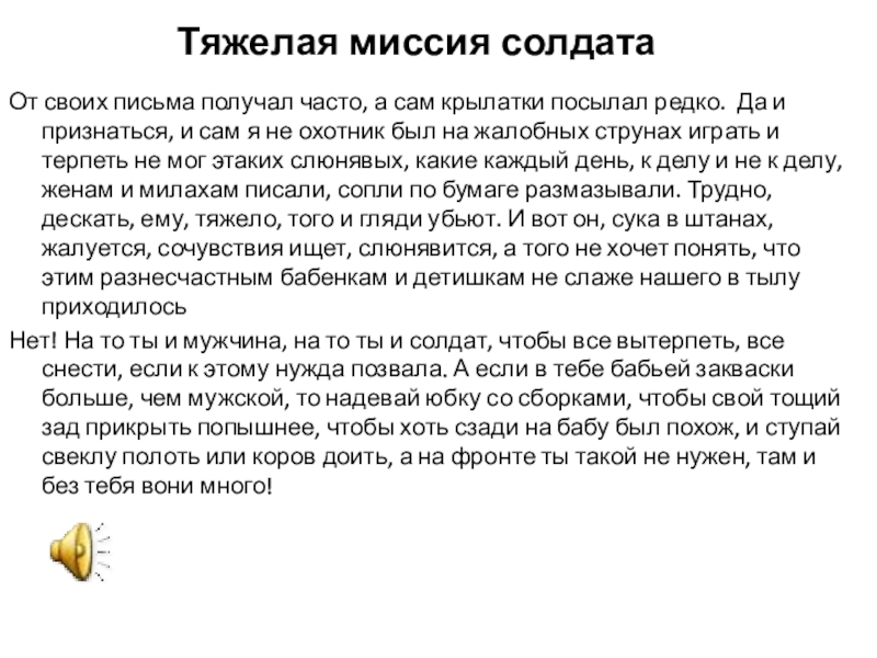 охотник был на жалобных струнах играть и терпеть не мог этаких слюнявых, какие каждый день, к делу и не к делу, женам и милахам писали, сопли по бумаге размазывали. Трудно, дескать, ему, тяжело, того и гляди убьют. И вот он, сука в штанах, жалуется, сочувствия ищет, слюнявится, а того не хочет понять, что этим разнесчастным бабенкам и детишкам не слаже нашего в тылу приходилось