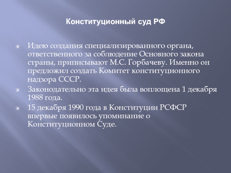 15 декабря 1990 года в Конституции РСФСР впервые появилось упоминание о Конституционном Суде.