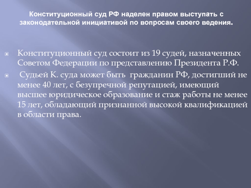 Слайд 8Конституционный суд РФ наделен правом выступать с законодательной инициативой по