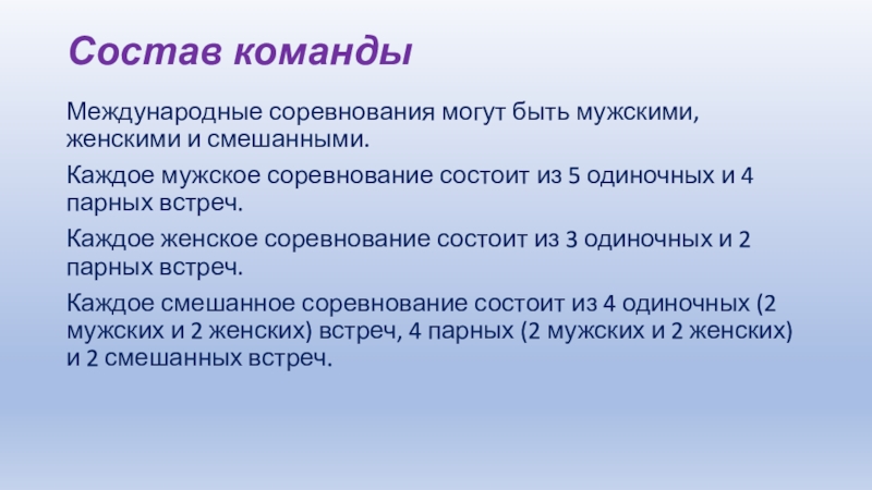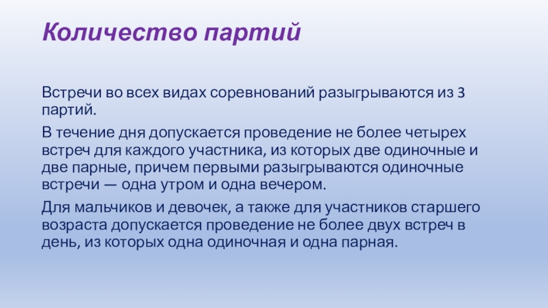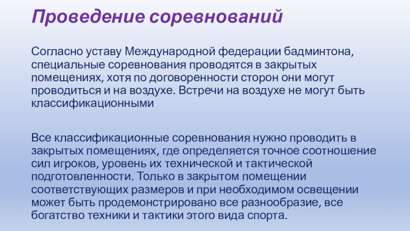 на воздухе. Встречи на воздухе не могут быть классификационнымиВсе классификационные соревнования нужно проводить в закрытых помещениях, где определяется точное соотношение сил игроков, уровень их технической и тактической подготовленности. Только в закрытом помещении соответствующих размеров и при необходимом освещении может быть продемонстрировано все разнообразие, все богатство техники и тактики этого вида спорта.