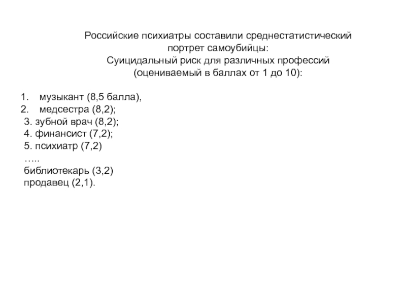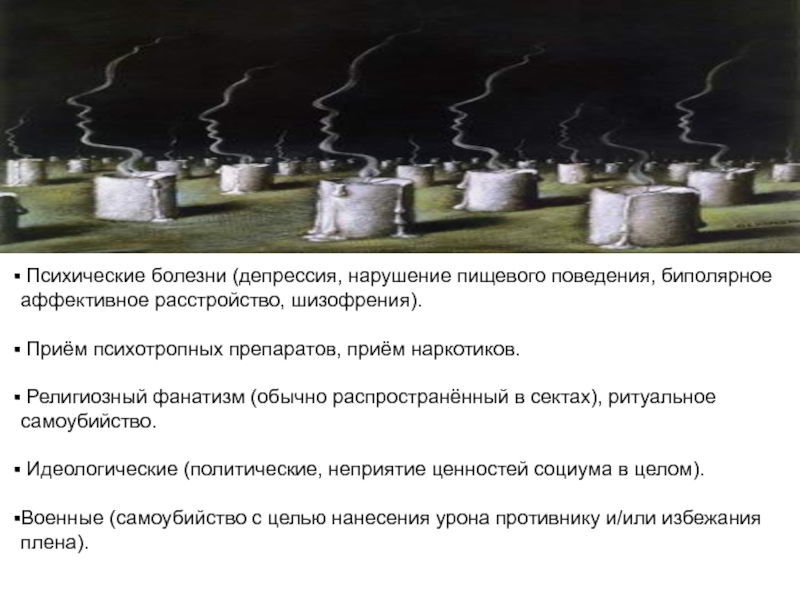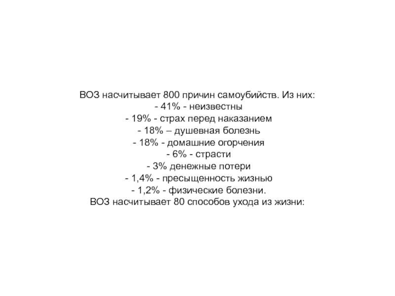 Слайд 19ВОЗ насчитывает 800 причин самоубийств. Из них: