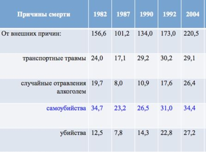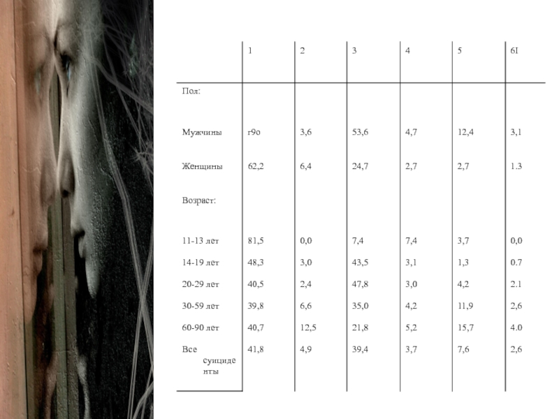 реально это делают, используя при этом более пассивные и менее опасные способы (поглощение таблеток, употребление вредных веществ и т. п.). Мужчины выбирают более активные и жестокие способы: вешаются, кидаются с высоты, стреляются, закалывают себя ножом.