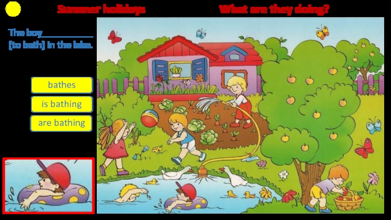 The boy__________ (to bath) in the lake.is bathingare bathingbathes