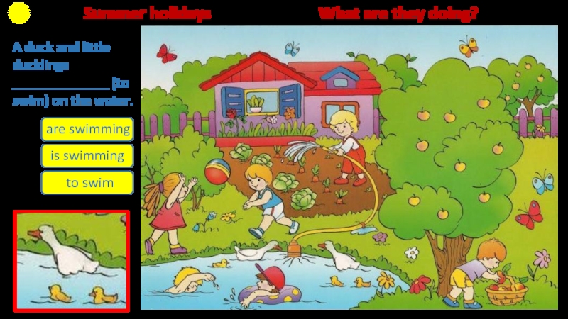 Слайд 9A duck and little ducklings _____________ (to swim) on