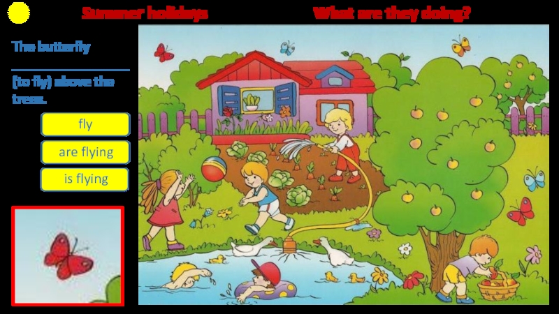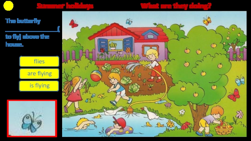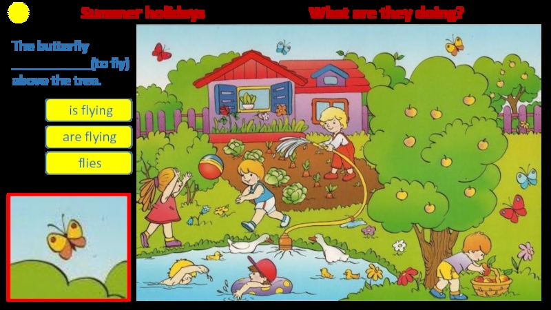 The butterfly________________(to fly) above the house.is flyingare flyingflies
