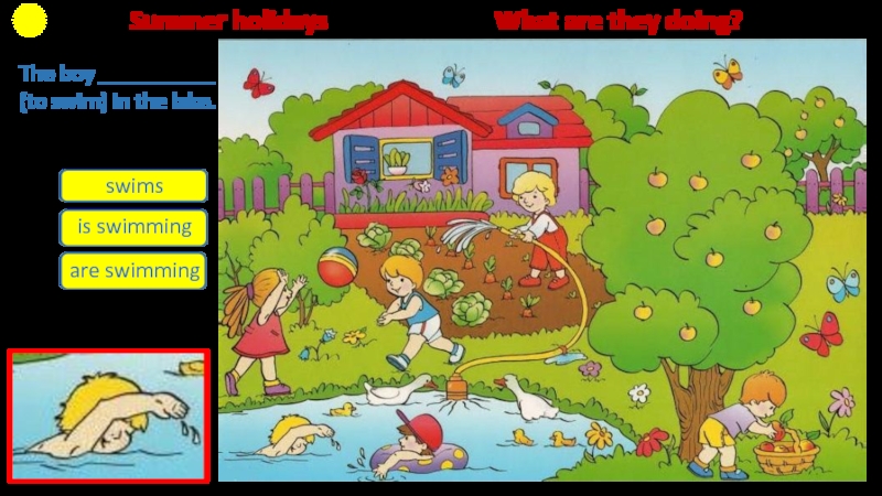 The boy __________ (to swim) in the lake.is swimmingare swimmingswims