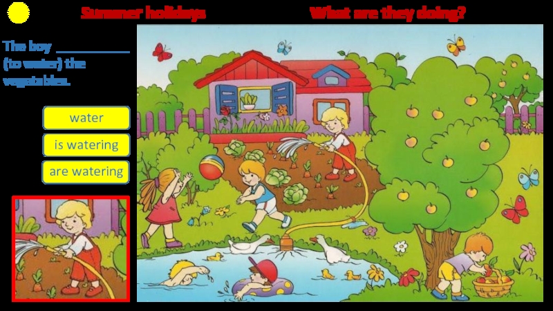 The boy __________(to water) the vegetables.is wateringare wateringwater