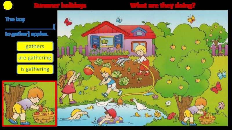 The boy________________(to gather) apples.is gatheringare gatheringgathers
