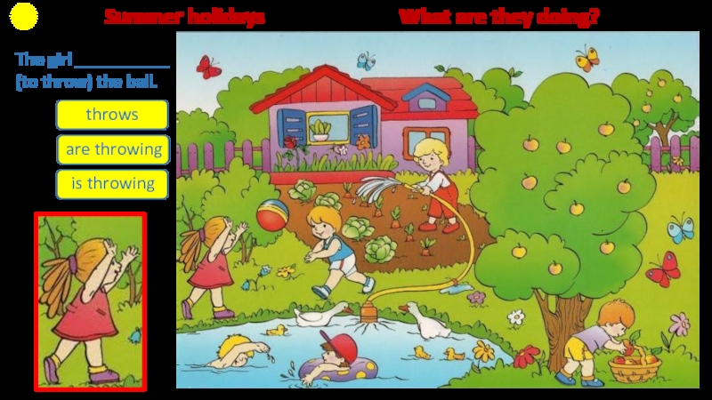 The girl __________ (to throw) the ball.is throwingare throwingthrows