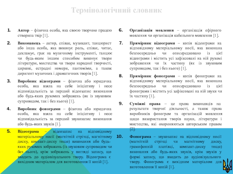 виконує роль, співає, читає, декламує, грає на музичному інструменті, танцює чи будь-яким іншим способом виконує твори літератури, мистецтва чи твори народної творчості, циркові, естрадні номери, пантоміми, а також диригент музичних і драматичних творів [1].Виробник відеограми – фізична або юридична особа, яка взяла на себе ініціативу і несе відповідальність за перший відеозапис виконання або будь-яких рухомих зображень (як із звуковим супроводом, так і без нього) [1].
