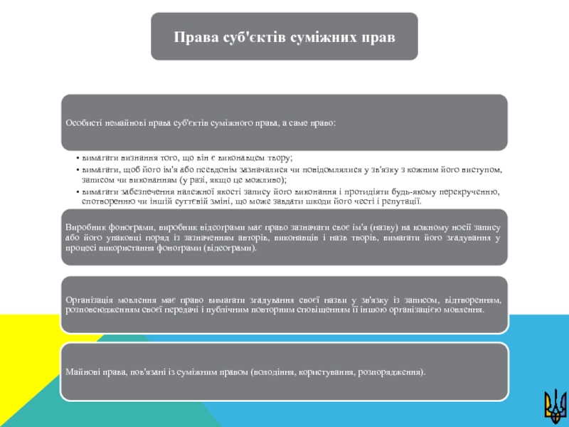 Суміжні права – це права виконавців на результати творчої діяльності, а також права виробників фонограм та організацій мовлення щодо використання творів науки, літератури і мистецтва, які охороняються авторським правом [2].