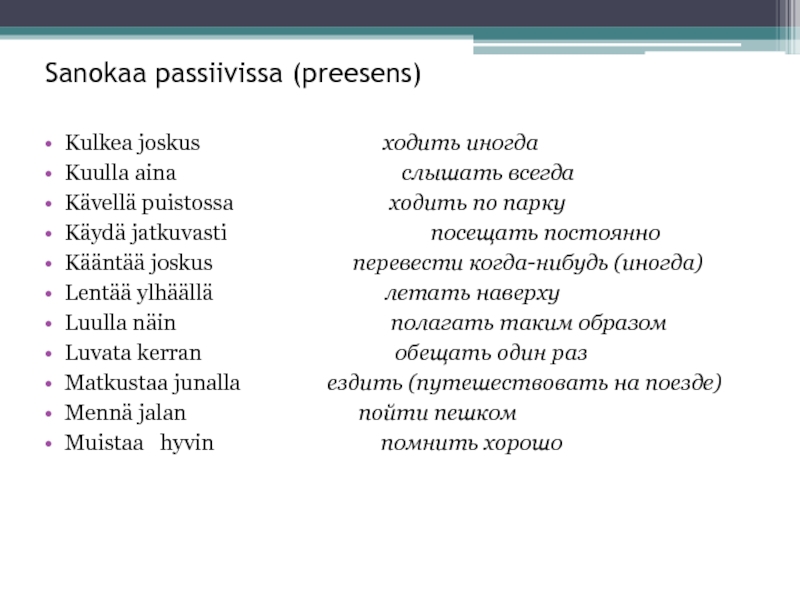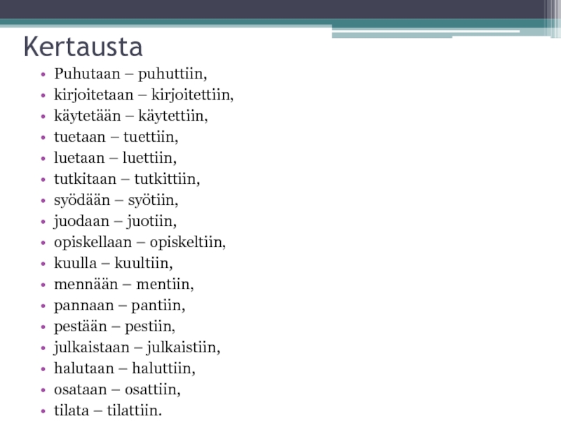 oleskella – oleskellaan – ei oleskella – oleskeltiin, (учиться)