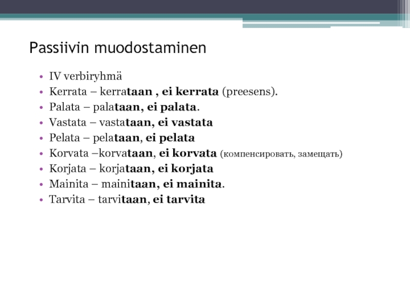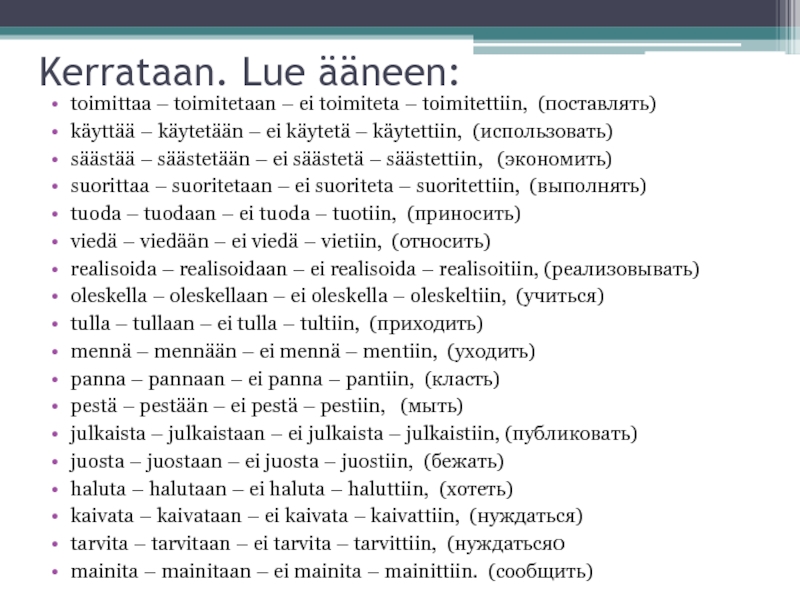 mainita – mainitaan – ei mainita – mainittiin. (сообщить)
