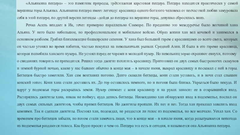 Слайд 18«Альянкина пещера» – это памятник природы, трёхэтажная карстовая пещера. Пещера