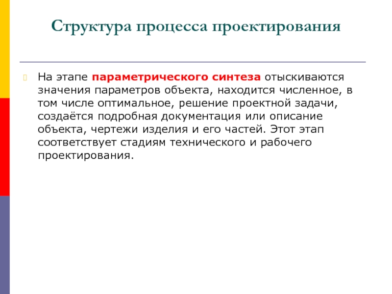 На этапе параметрического синтеза отыскиваются значения параметров объекта, находится численное, в том числе оптимальное, решение проектной задачи, создаётся подробная документация или описание объекта, чертежи изделия и его частей. Этот этап соответствует стадиям технического и рабочего проектирования.