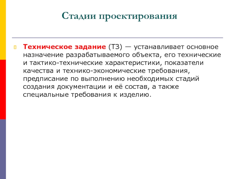 Техническое задание (ТЗ) — устанавливает основное назначение разрабатываемого объекта, его
