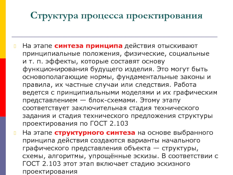 На этапе структурного синтеза на основе выбранного принципа действия создаются варианты начального графического представления объекта — структуры, схемы, алгоритмы, упрощённые эскизы. В соответствии с ГОСТ 2.103 этот этап включает стадию эскизного проектирования