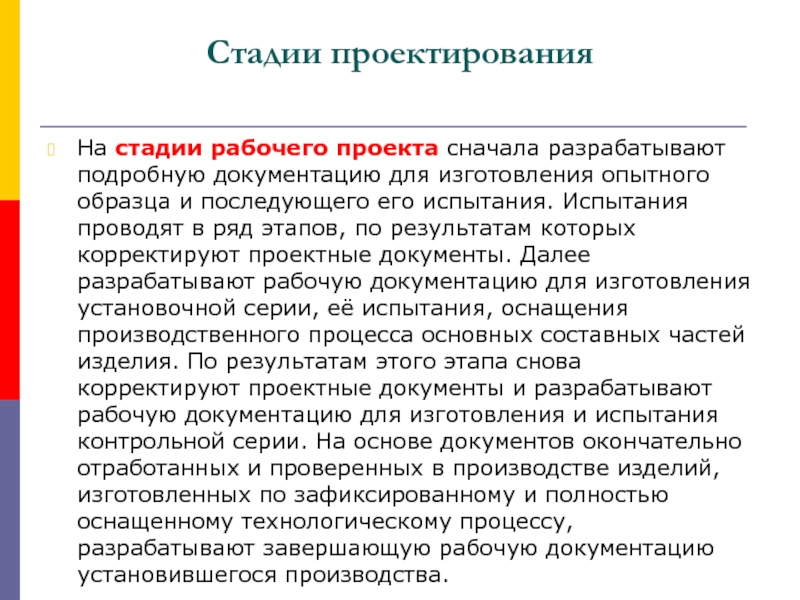этапов, по результатам которых корректируют проектные документы. Далее разрабатывают рабочую документацию для изготовления установочной серии, её испытания, оснащения производственного процесса основных составных частей изделия. По результатам этого этапа снова корректируют проектные документы и разрабатывают рабочую документацию для изготовления и испытания контрольной серии. На основе документов окончательно отработанных и проверенных в производстве изделий, изготовленных по зафиксированному и полностью оснащенному технологическому процессу, разрабатывают завершающую рабочую документацию установившегося производства.
