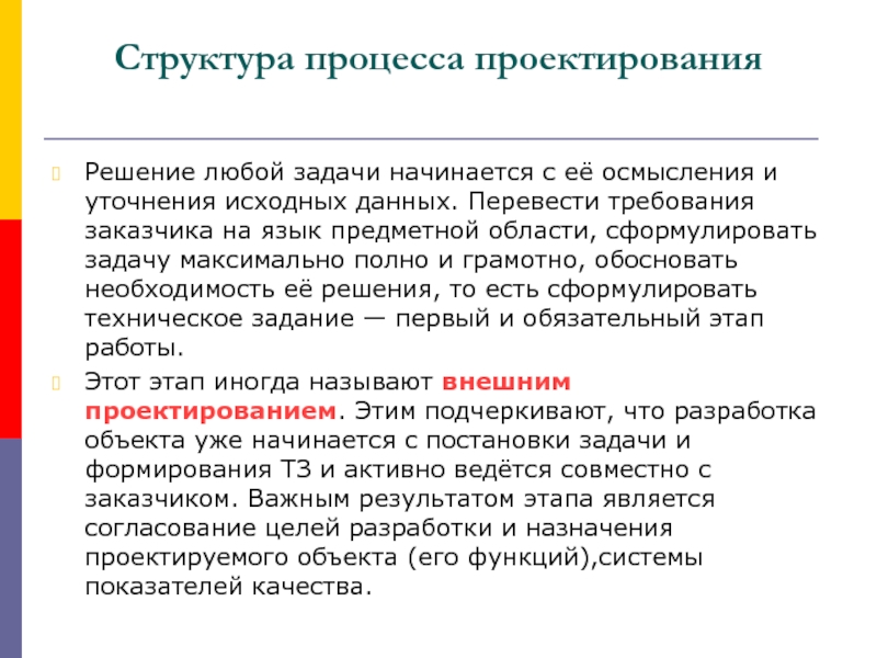 Этот этап иногда называют внешним проектированием. Этим подчеркивают, что разработка объекта уже начинается с постановки задачи и формирования ТЗ и активно ведётся совместно с заказчиком. Важным результатом этапа является согласование целей разработки и назначения проектируемого объекта (его функций),системы показателей качества.