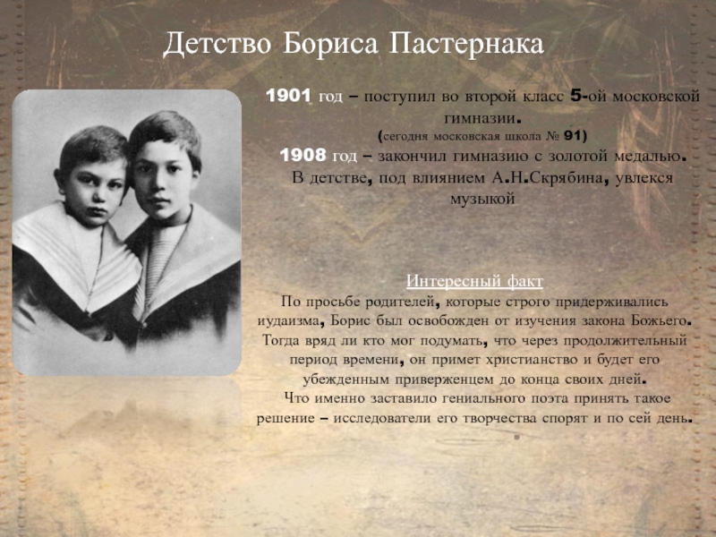 По просьбе родителей, которые строго придерживались иудаизма, Борис был освобожден от изучения закона Божьего.