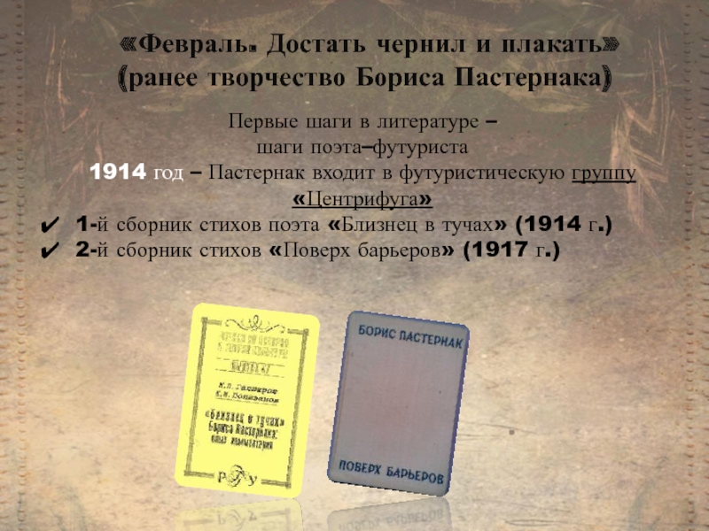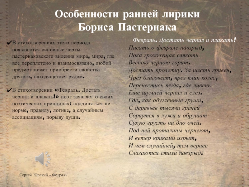 В стихотворении «Февраль. Достать чернил и плакать!» поэт заявляет о своих поэтических принципах: подчиняться не норме, правилу, логике, а случайным ассоциациям, порыву души.