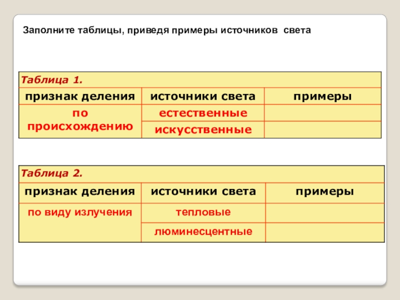 Слайд 10Заполните таблицы, приведя примеры источников света