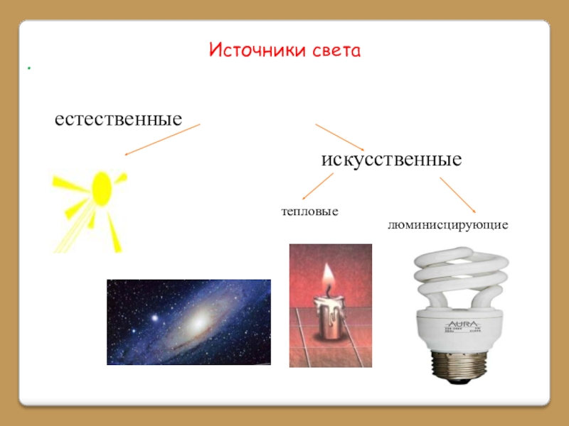 Источники светаестественныеискусственныетепловые люминисцирующие.