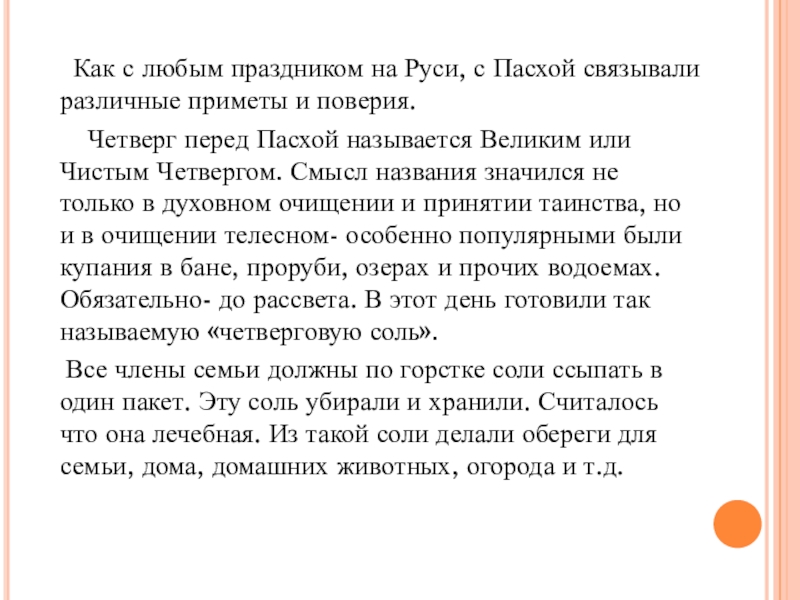 Четверг перед Пасхой называется Великим или Чистым Четвергом. Смысл названия значился не только в духовном очищении и принятии таинства, но и в очищении телесном- особенно популярными были купания в бане, проруби, озерах и прочих водоемах. Обязательно- до рассвета. В этот день готовили так называемую «четверговую соль».