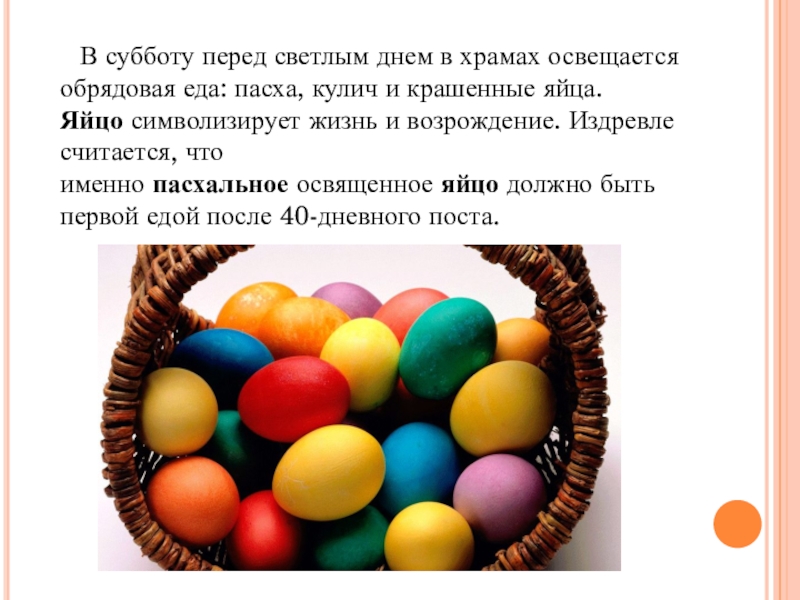 и возрождение. Издревле считается, что именно пасхальное освященное яйцо должно быть первой едой после 40-дневного поста.