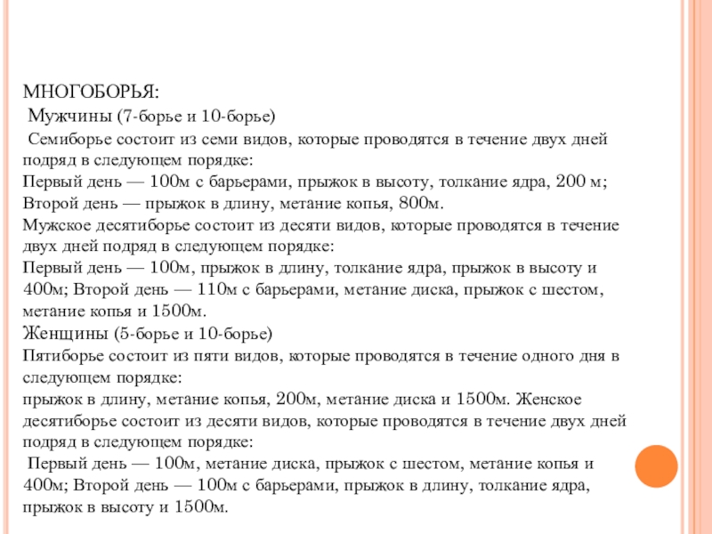 прыжок в длину, метание копья, 200м, метание диска и 1500м. Женское десятиборье состоит из десяти видов, которые проводятся в течение двух дней подряд в следующем порядке: