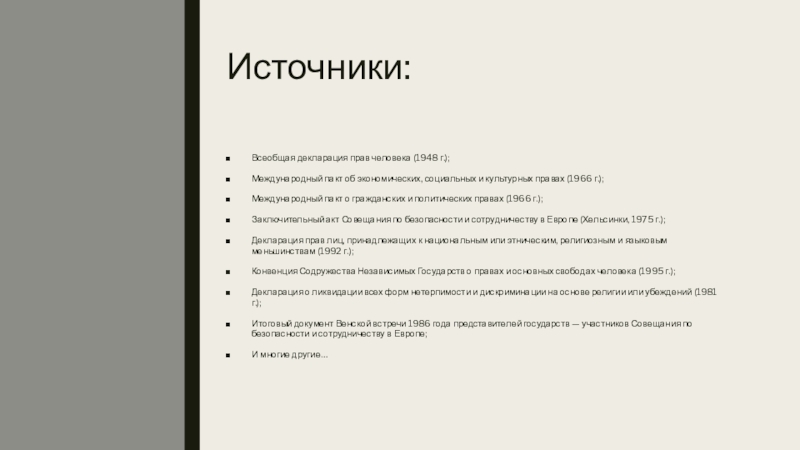 правах (1966 г.);Заключительный акт Совещания по безопасности и сотрудничеству в Европе (Хельсинки, 1975 г.);